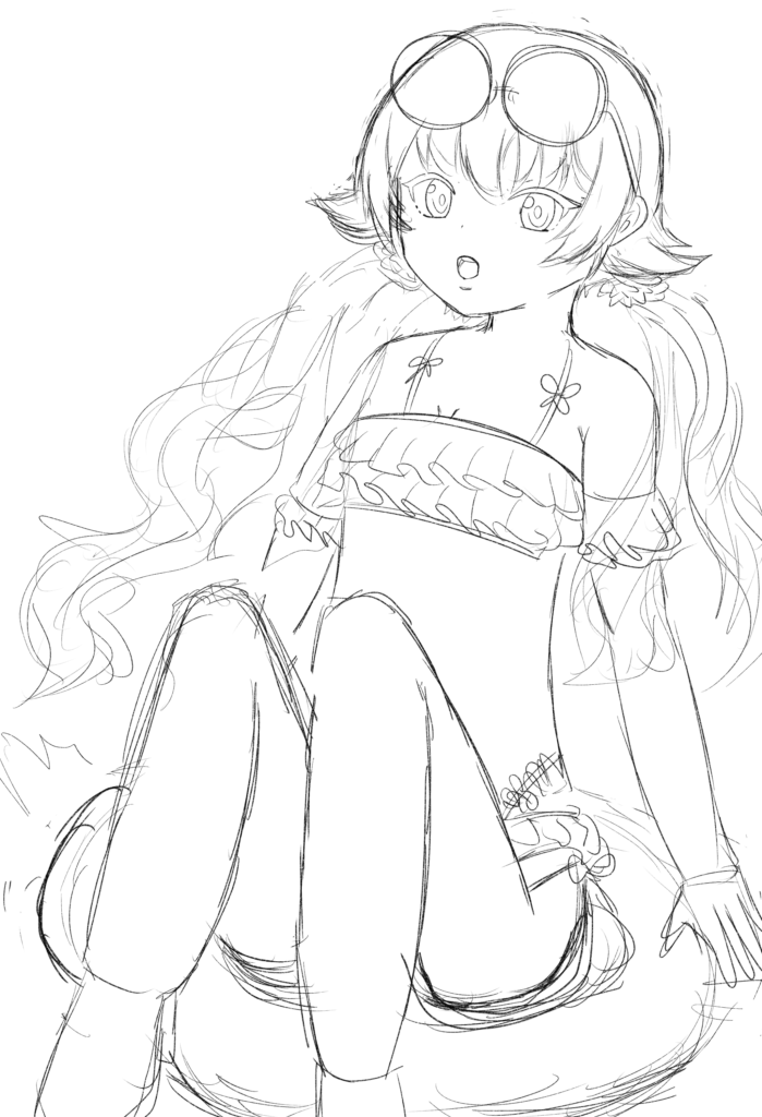 これは試行錯誤中の下書きで、かわいそうなくらい窮屈に浮き輪に閉じ込められていたヒフミ。リクライニングシートの倒れ方を思い出して、足を修正したり、学びの多い絵だった……。